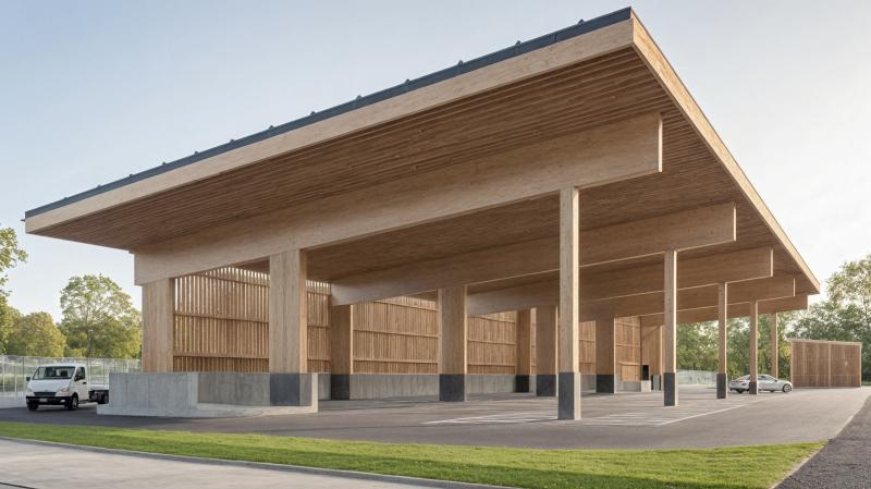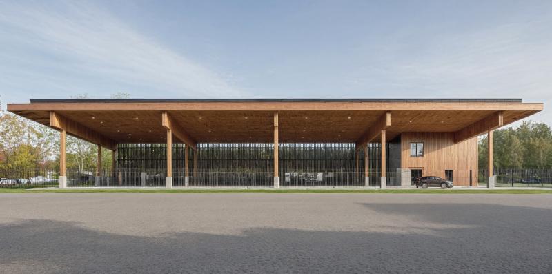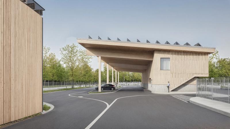 Rund 500 Meter flussabwärts konnte die Stadt Adliswil eine benachbarte städtische Parzelle durch einen Pachtvertrag nutzen und so Platz für ein neues, grosszügiges Recyclingzentrum schaffen. Ausgehend von einer optimierten Verkehrsführung wird ein Neubau geplant, der unter einem 1.500 qm großen, hölzernen und begrünten Flachdach alle Funktionen des Recyclingzentrums vereint. Neben Abstellflächen für anliefernde Kunden sind Standorte für Mulden und Container vorgesehen. In dem gedämmten Holzelementkubus werden Büros, Garderoben und Sozialräume untergebracht.