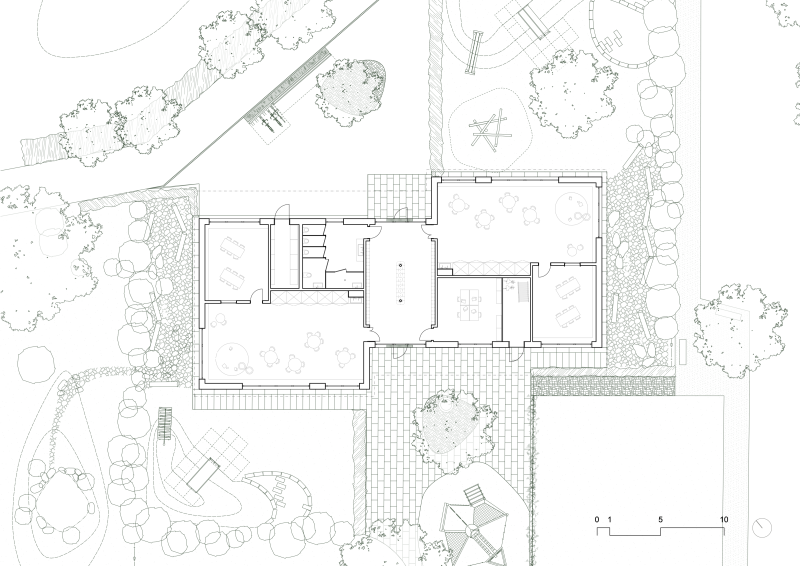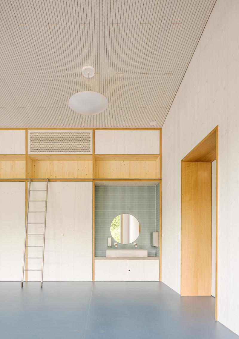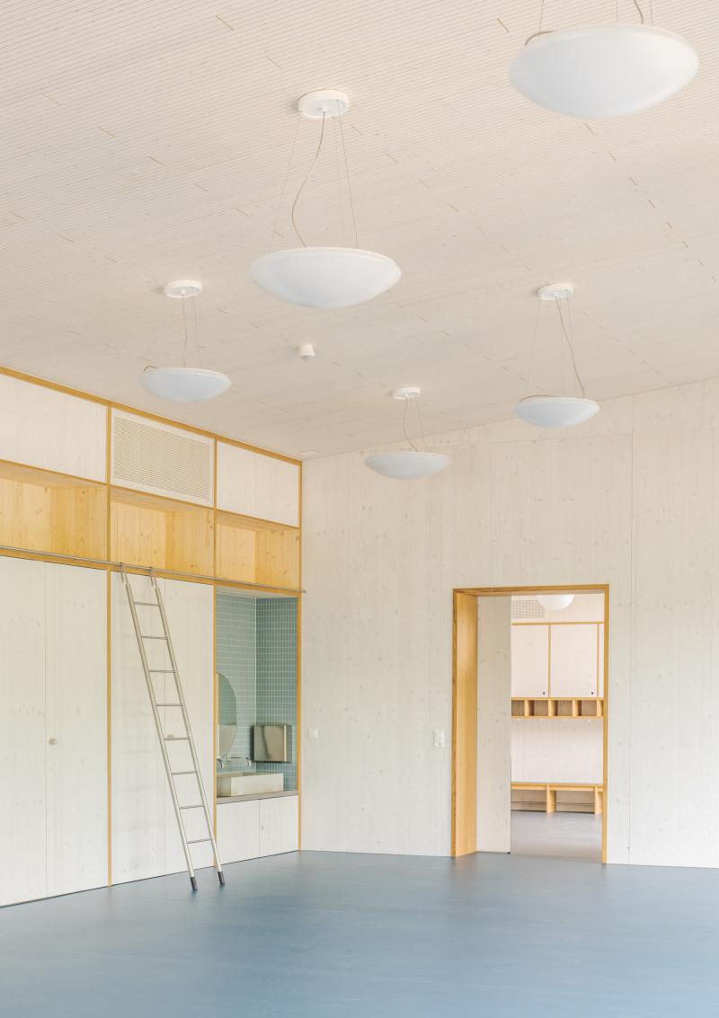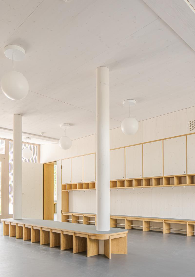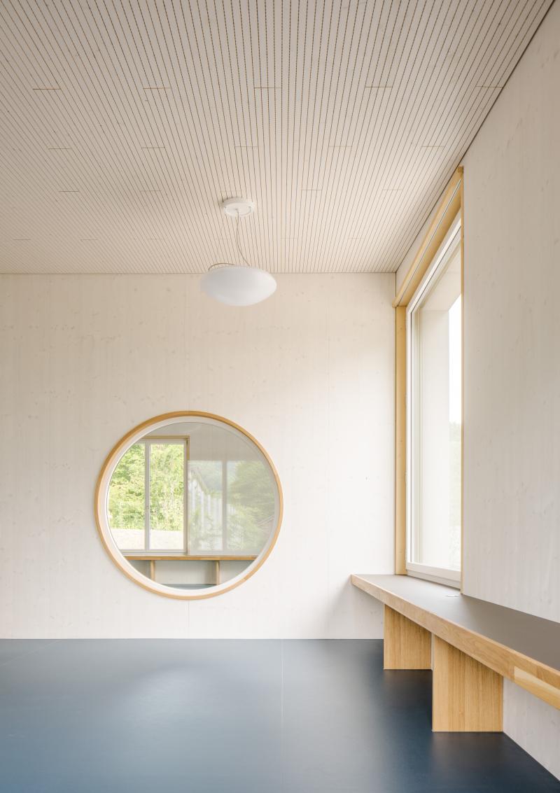 Der Innenraum des Kindergartens ist hell und weit. Die großen Fenster lassen viel Tageslicht herein und öffnen den Blick nach draussen in den Garten.