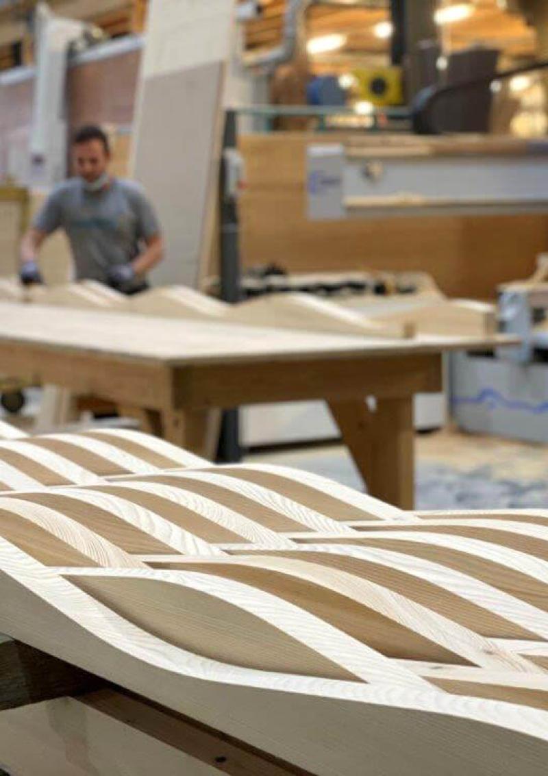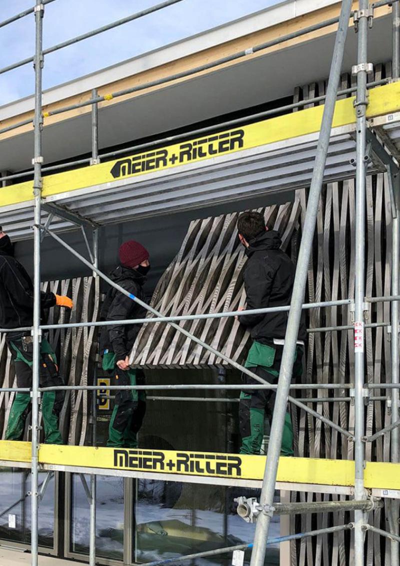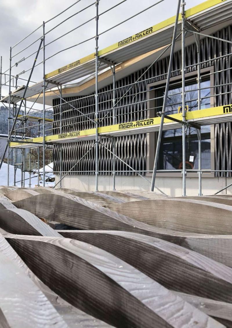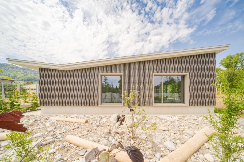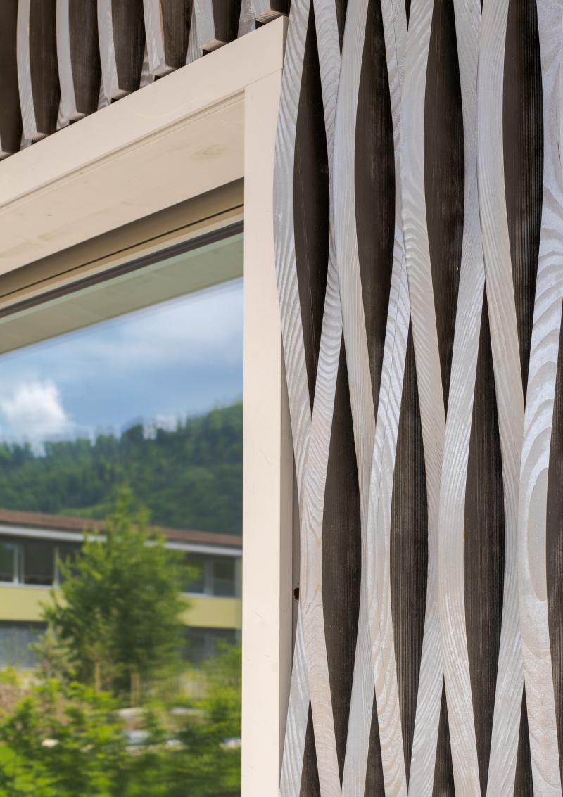 Die wellenförmigen Holzlatten der vorgefertigten Hohlkasten-Wände lassen die Nähe zur Sihl, dem benachbarten Fluss, spürbar werden.