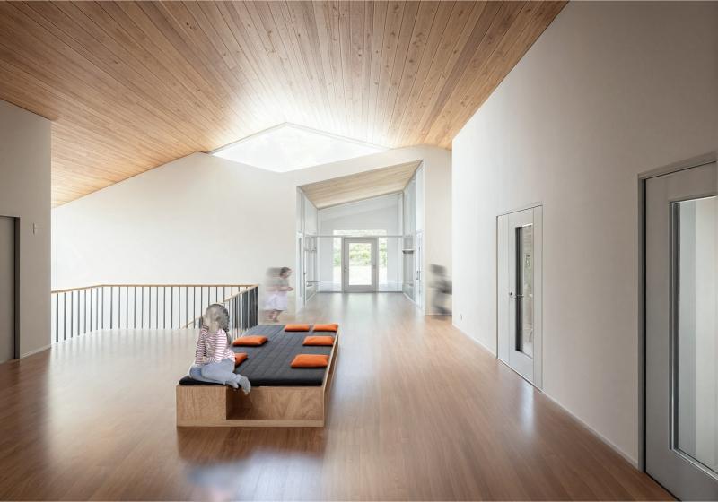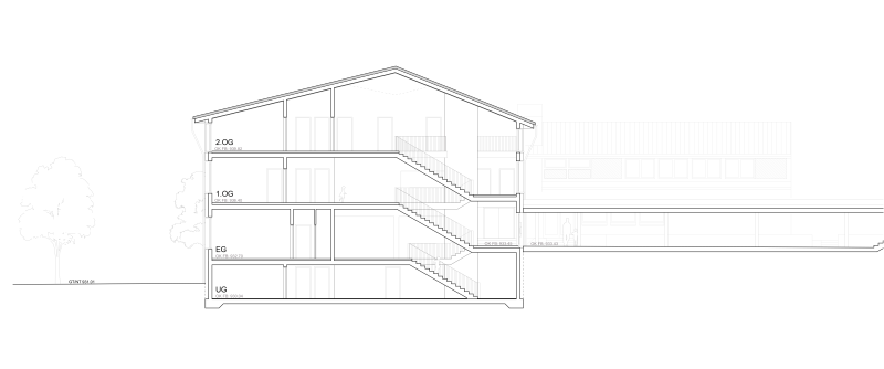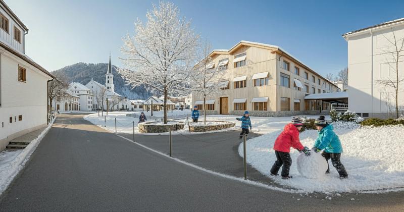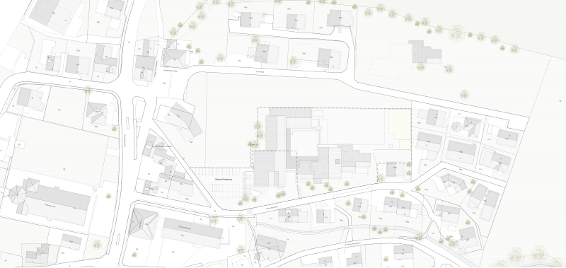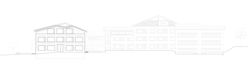 Die Erweiterung fügt sich sensibel in den städtebaulich prägnanten Raum von Rothenthurm ein, wahrt Sichtbeziehungen und respektiert die Eigenständigkeit der bestehenden öffentlichen Bauwerke.