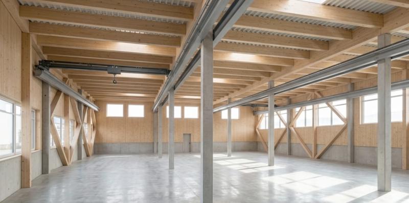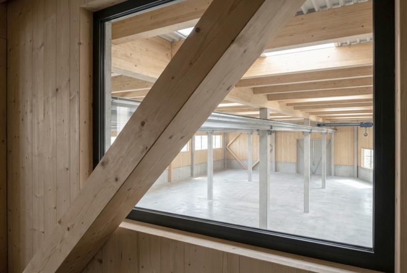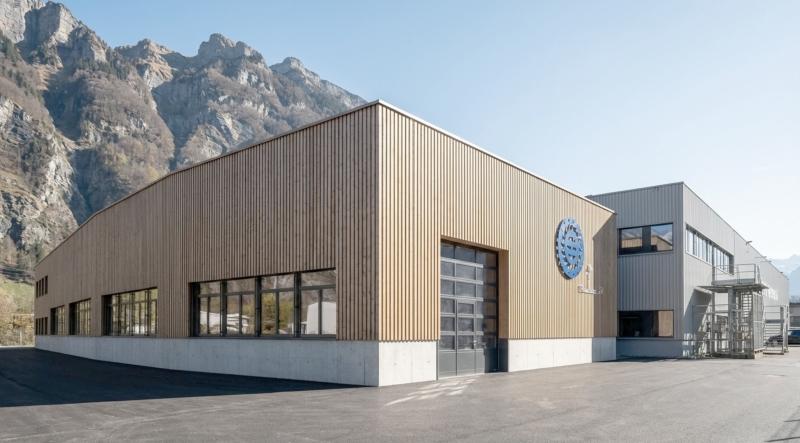 Die hybride Konstruktion aus lokalem Nadelholz und Beton verbindet industrielle Funktionalität mit einer klaren architektonischen Präsenz in der alpinen Landschaft des Glarner Tals.