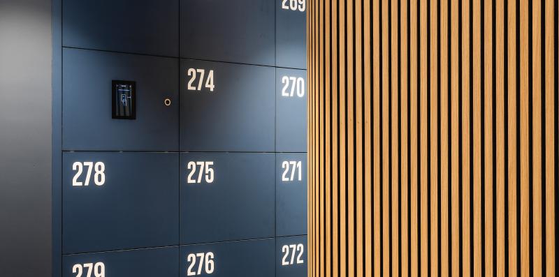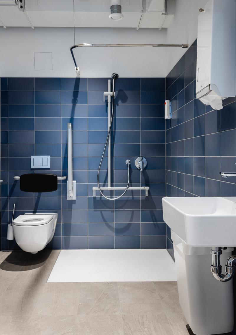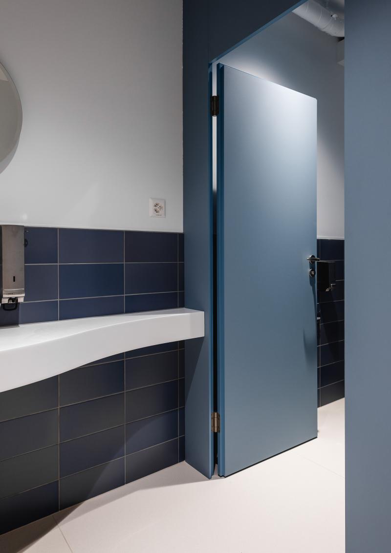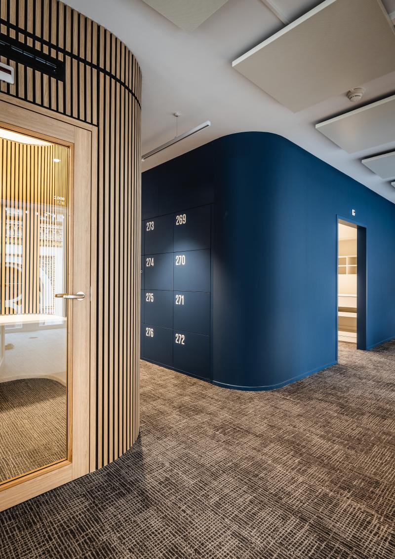 Materialität und Farbgebung wie ruhiges Blau, weisses Deckengefüge und warmes Holzfurnier schaffen lebendige Kontraste.